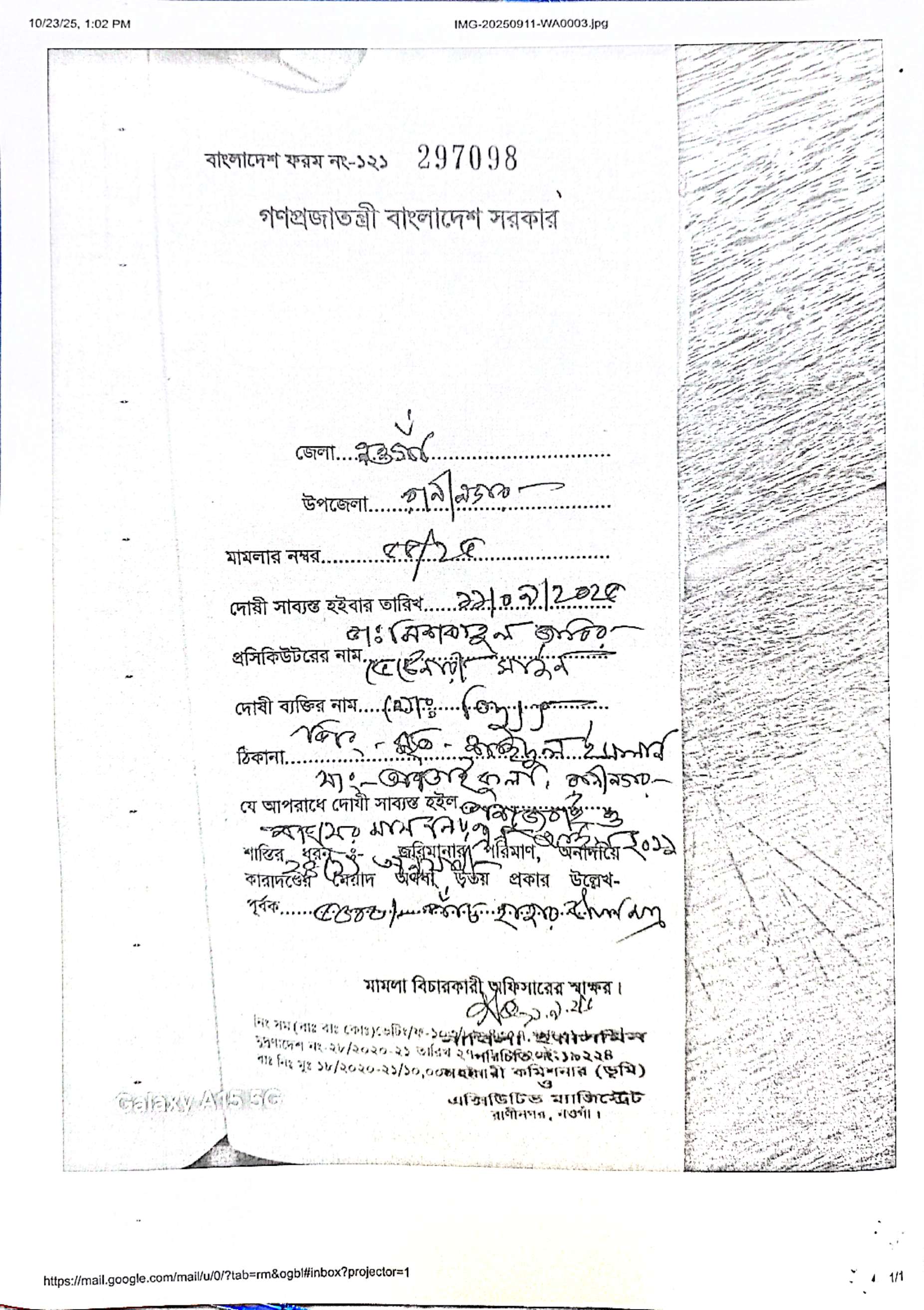 | ২ | মোবাইল কোট ৫,০০০/- টাকা জরিমানা। | | | ৩০-১০-২০২৫ | দেখুন |