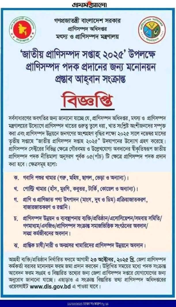 | ৪ | জাতীয় প্রাণিসম্পদ পদক সংক্রান্ত বিজ্ঞপ্তি | | | ১৬-১০-২০২৫ | দেখুন |